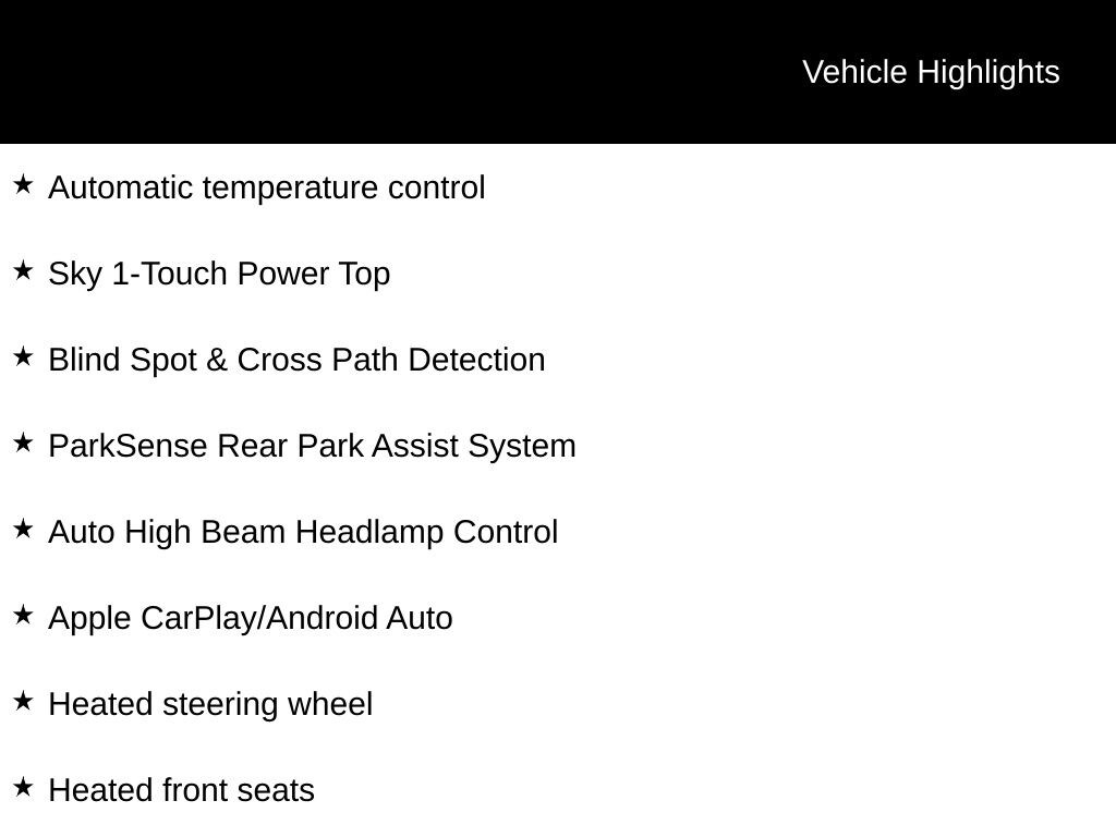 INCLUDES LIFETIME POWERTRAIN WARRANTY, REMAINDER OF FACTORY WARRANTY, CLEAN VEHICLE HISTORY...NO ACCIDENTS!, ONE OWNER, 4WD, AM/FM radio: SiriusXM, Apple CarPlay/Android Auto, Auto High Beam Headlamp Control, Automatic temperature control, Blind Spot & Cross Path Detection, Heated front seats, Heated steering wheel, ParkSense Rear Park Assist System, Radio: Uconnect 5 w/12.3" Display, Rear Window Defroster, Rear Window Wiper/Washer, Removable Rear Quarter Windows, Safety Group, Sky 1-Touch Power Top, Wheels: 20" x 8" Painted Black Aluminum.