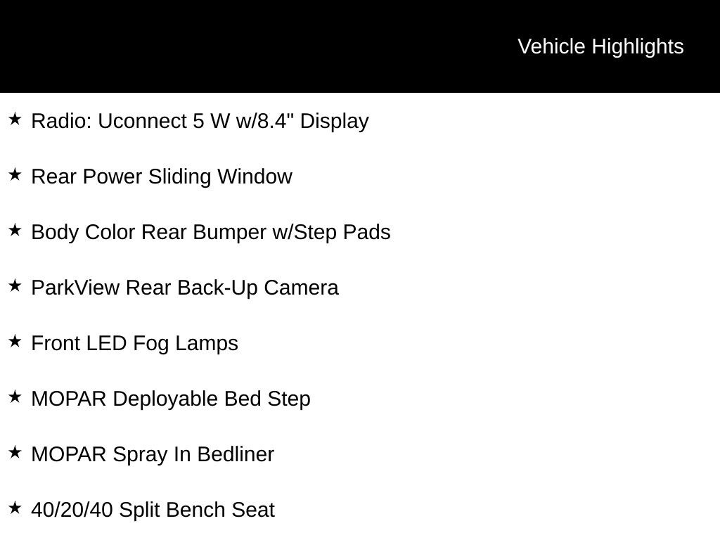 INCLUDES LIFETIME POWERTRAIN WARRANTY, REMAINDER OF FACTORY WARRANTY, CLEAN VEHICLE HISTORY...NO ACCIDENTS!, ONE OWNER, 4D Crew Cab, 4WD, 40/20/40 Split Bench Seat, Bed Utility Group, Body Color Rear Bumper w/Step Pads, Cloth Bench Seat, Front LED Fog Lamps, MOPAR Deployable Bed Step, MOPAR Spray In Bedliner, ParkView Rear Back-Up Camera, Radio: Uconnect 5 W w/8.4" Display, Rear Power Sliding Window, SiriusXM Satellite Radio, Sport Appearance Package, Tradesman Level 1 Equipment Group, Wheels: 20" x 9.0" Aluminum Polished Painted.
