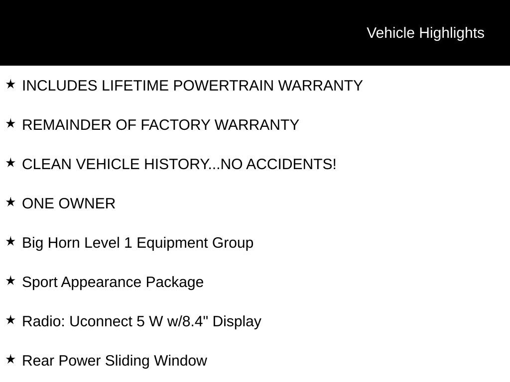 INCLUDES LIFETIME POWERTRAIN WARRANTY, REMAINDER OF FACTORY WARRANTY, CLEAN VEHICLE HISTORY...NO ACCIDENTS!, ONE OWNER, 4D Crew Cab, 4WD, Big Horn Level 1 Equipment Group, Body Color Front Bumper, Body Color Rear Bumper w/Step Pads, Heated Front Seats, Heated Steering Wheel, ParkView Rear Back-Up Camera, Power Adjustable Pedals, Radio: Uconnect 5 W w/8.4" Display, Rear Power Sliding Window, Sport Appearance Package, Steering Wheel Mounted Audio Controls, Universal Garage Door Opener, Wheels: 20" x 9" Aluminum Chrome Clad (WRK).